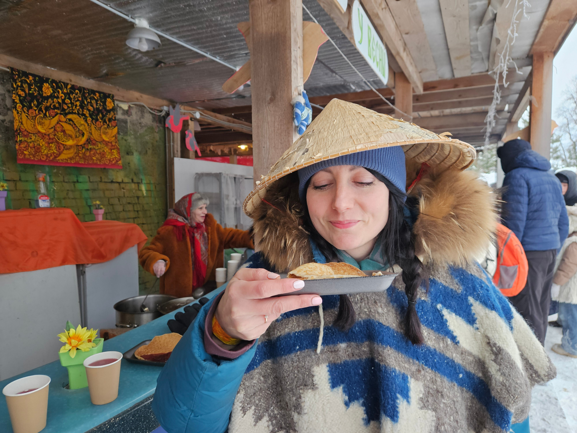 В Гуслице есть потрясающая костюмерная, первым делом мы пошли туда. Я долго выбирала и остановилась на эскимосско-вьетнамском образе. Тёплое пончо и соломенная шляпа. Павел же решил стать зажиточным боярином в овчинном тулупе, но с изюминкой: на шляпе висело что-то похожее на макароны с бусинами.